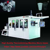 plastic cup machine which produces plastic products which adopts servo motor to draw sheet. It controls by PLC and touch screen. Features: 1)It produces such plastic products as disposable plastic cups, plastic bowls, ice cream cups, cold drinking cups, yoghurt cups, instant-food boxes and bowls, plastic dishes, plastic trays, plastic covers, plastic lids, vessels for fast food and pharmaceutical linings. 2) It's forming sheets as PP, PVC, PS, and PET and other sheet. 3) It adopts PLC and touch screen control equipment operation. 4)Mould Adopts four pillars to fix mould. 5) Mould movement adopts hydraulic pressure drive. 6) Mechanism movement adds automatically oil to lubricate at certain time. 7) Temperature controller module control each temperature area. 8) It can finish production at one time through sheet feeding, heating, stretching, forming and side-cutting. 9) It can produce different products by different moulds. 10) Stable operation and reliable performance, low noise, high quality. Technical Parameter 1.Forming Area: 650mm x 320mm 2.Forming Depth: 130mm 3. Max. Forming Speed: 25 - 35 cycles/min 4. Adjustable travel: 100mm - 350mm 5. Feeding Motor: 1.5kw 6. Oil Pump: 7.5kw 7. Actual Power: 55kw 8. Rated Power: 80kw 9. Air Pressure: 0.6-0.8mpa 10. Gas Consumption: about 1.6m3/min 11. Water Consumption: Circle 12. Sheet Width(Max):650mm 13. Sheet Roller Diameter(Max): 600mm 14. Sheet Thickness: 0.3mm-1.2mm 15. Overall Dimension: L4800mm x W1600mm x H2700mm 16. Weight: about 4.0T For assistant equipments as following: 1. Cup Stacker TD-670 2. Chiller 3F 3. Compressor 3.0m3/min